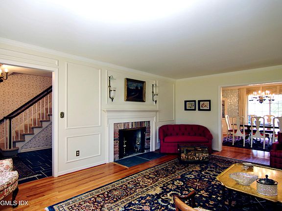 One of North Stamford's loveliest fine homes' streets is the setting for this 3900+sq ft 4BR/3B country Colonial that is privately set on nearly 1.5-lovely usable acres, embraced by mature trees and dotted with stone wall charm. The house has lg windows+2-sliding glass doors that fill the generous-sized rms w natural light & property views for those days when you're not on 1 of the home's 2-decks. Hdwd flrs, 2-fpls, moldings, built-ins, beams & millwork add character. There's a main flr office+ main flr Great room, while , main flr family room is well-located near Kit. Spacious MBR w en site+3-lg BRs are all sun-filled. Fantastic space and light, terrific layout, wonderful setting in a sought-after neighborhood w city water + 7-yr old roof & 4-5-yr old boiler ... it's waiting for you