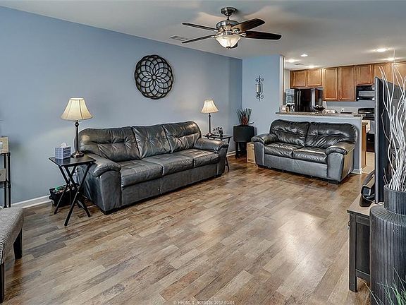 Don't miss this newer, open concept 3 bedroom 2.5 bath home with 1 car garage in Southern Oaks. Laminate flooring downstairs in the great room, dining room, and Carolina room provide the wood look plus durability. Kitchen has tile floor, upgraded refrigerator, breakfast bar and pantry. Upstairs the owner's suite has vaulted ceiling and a walk-in closet. Two guest rooms share a full bath. A covered porch and large fenced yard with firepit overlook a lagoon. Southern Oaks amenities include pool, volleyball court, and sidewalks.
