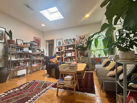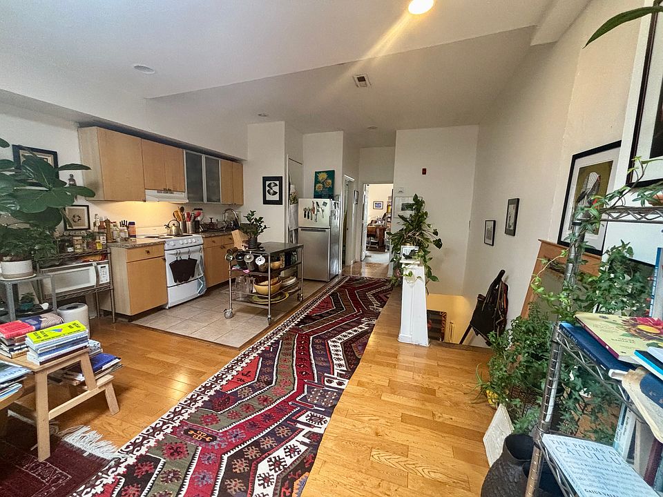 The apartment features a private mudroom entry perfect for storing coats, shoes, or bikes. As you ascend the stairs, you're greeted by a spacious open-concept living and kitchen area with a skylight, hardwood floors, and recessed lighting that fill the space with warmth and natural light. The kitchen offers light oak cabinetry, granite countertops, a stainless-steel refrigerator and sink, and a four-burner electric range, with room to add a small dining table and rolling island.