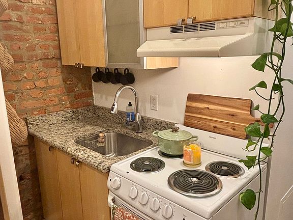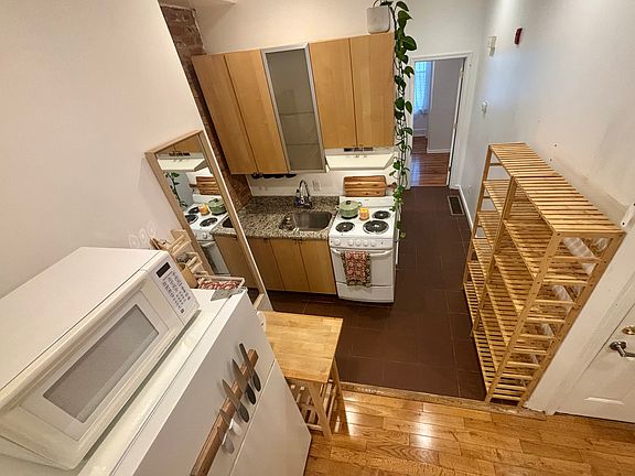 The kitchen is compact but exceptionally well-designed for those who value thoughtful, cozy spaces. It includes light oak cabinetry, granite countertops, an electric four-burner range, stainless steel sink, refrigerator, freezer, microwave, and oven. Several space-saving and aesthetic touches will remain for tenant use, including a kitchen cart, bamboo shelving, built-in spice racks, magnetic knife strip, wall-mounted fruit baskets, fridge-mounted paper towel holder, and full-length mirror.
