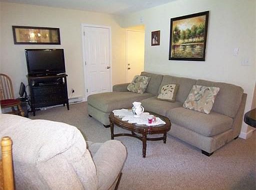 The best spot in the complex! Private end unit overlooking woods/river and walking path. Exceptionally well maintained one owner upgraded unit. Open floor plan with brand new wood/laminate floors just installed. Kitchen features up graded and extra cabinets, granite island/breakfast bar, stainless steel appliances and dining area with large window facing the back. Slider from living room to private covered porch area with room to grow potted plants/vegetables. Master bedroom has large walk in closet. Full bath with new fixtures and linen closet. Laundry is in the basement directly from main unit door. Large private storage unit in basement for extra storage. The complex is very convenient to major highways and local attractions. Unit is in absolute total move in condition. Clean and bright. Relax on the rear covered deck and enjoy the view. All appliances,and air conditioner to stay. You will not be disappointed!!