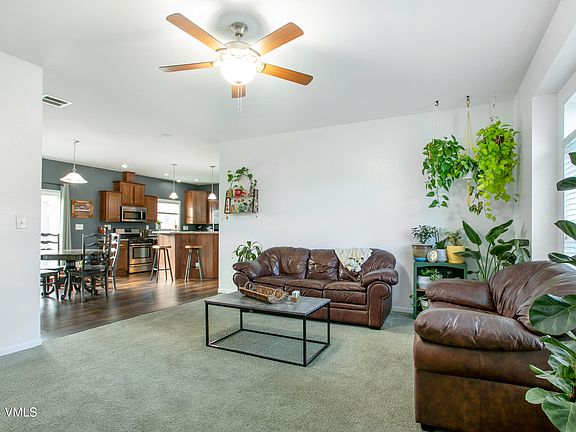 This single family home's open layout provides a welcoming flow, with a large living room, dining area and the adjoining kitchen. A generous center island enhances both functionality and entertaining opportunities. Direct access from the Kitchen into the laundry area, half bath, and garage add everyday convenience. The large primary bedroom has a full ensuite bath and the two additional bedrooms have access to an additional full bath. A spacious two-car attached garage and additional driveway space for parking.