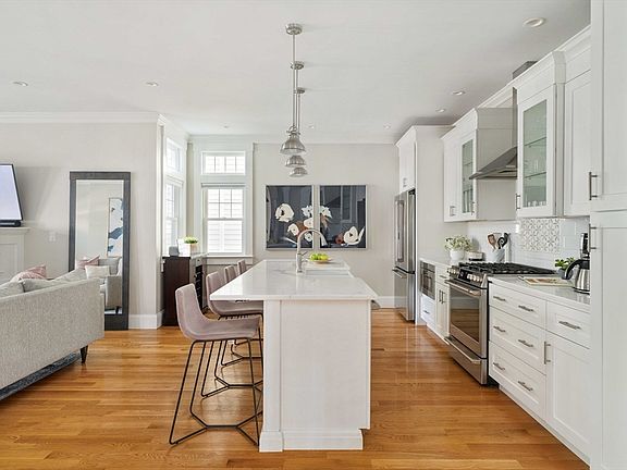 OPEN HOUSES CANCELLED. Just moments away from Gilman and Union Squares, this 2020 gut renovated 3-bedroom, 2.5-bathroom unit presents an open concept living space and exceptional craftsmanship, with soaring ceilings, elegant crown moldings, and stunning oak flooring. The kitchen is adorned with quartz countertops, stainless steel appliances, and an abundance of luxurious cabinetry. Recessed lighting seamlessly connects to the living and dining area, completed with a charming gas fireplace. The first level is completed by a stunning primary bedroom featuring a luxurious en-suite marble bathroom, as well as a convenient half bath located near the backyard entrance. Descend to the finished basement to discover two additional bedrooms, a full bath, laundry, and a versatile bonus room. Close to the Gilman Square Green Line and popular Somerville spots, including Sarma, Highland Kitchen, Winter Hill Brewery, and Union Square.