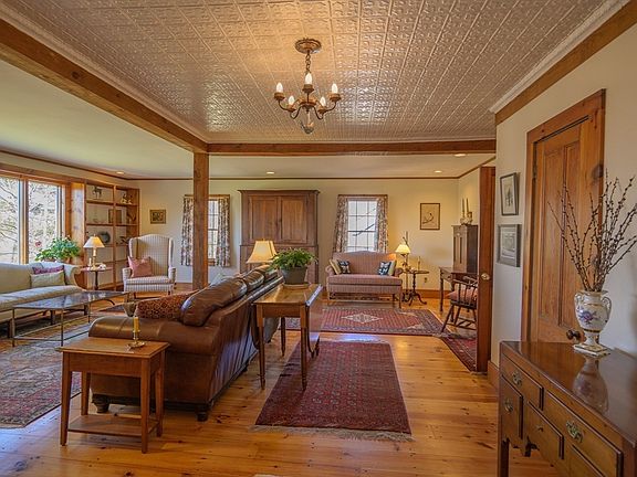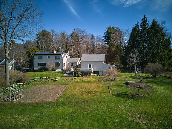 Historic charm and breathtaking panoramas of the Holyoke Range highlight this updated, 1810 home. Open country kitchen/dining room offers views of the well-maintained gardens, ornamental trees and shrubs. An expansive fireplaced living room with built-ins and original tin ceiling is the perfect spot to unwind and enjoy the scenery. A mudroom, with ample space for coats/boots, and laundry with pantry space, add convenience and functionality. A full bath, family room (or office), also with tin ceiling, complete the first level. Upstairs are 3 spacious bedrooms with 2 full baths. Waken to spectacular vistas from the ensuite primary bedroom. A woodstove, solar panels, and new heating/cooling system ensure comfort and sustainability. The barn offers bays for two cars, a loft, wood- and potting-sheds and plenty of space for storage and hobbies. An attached deck offers yet another area to enjoy the setting. This must-see home combines comfort, charm, and functionality with a sweeping view.