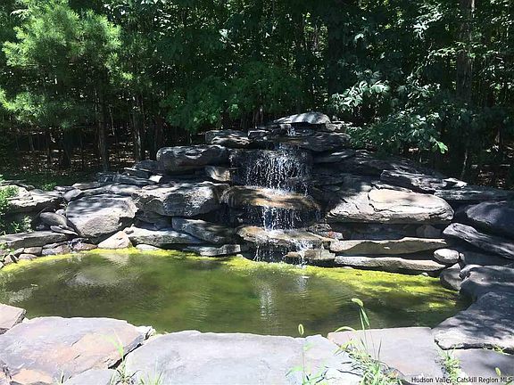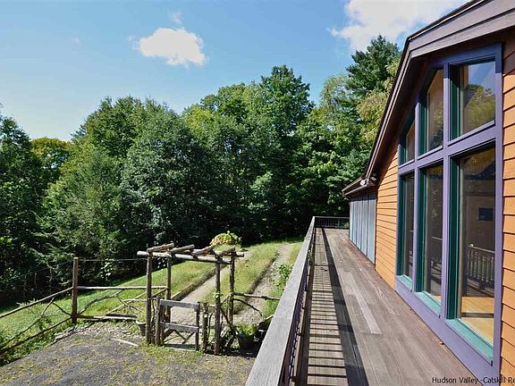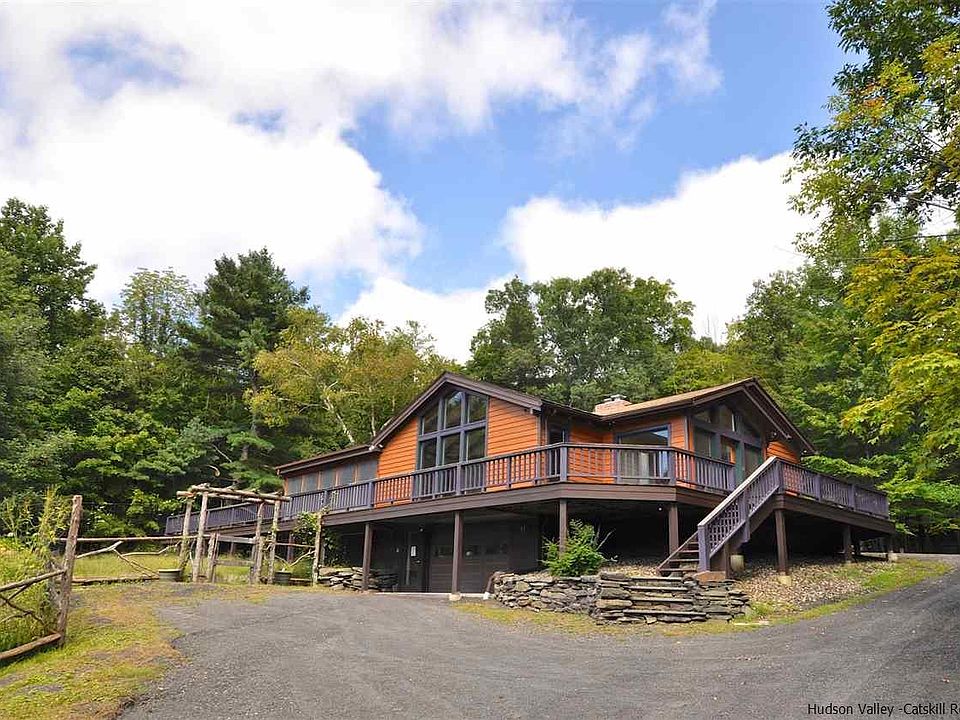On the market for the first time in more than four decades, this secluded contemporary is sure to please the most discerning buyers. Located on a beautiful scenic rd, it is walkable to the Woodstock village! This beautiful home is all on one level. The huge gourmet kitchen is simply amazing with cabinets galore, a dining area, a central island, a cooktop besides a gas range, skylights letting in tons of lights. Off of the kitchen is a bedroom that has been used as an office/library with built-in bookshelves. Across the hall is another room that was used as a den/library, with sliders to a beautiful 4 season enclosed screened in porch. The enormous living room has gorgeous tall windows, hardwood floors and a fireplace. A bright foyer graces the entrance to the current master bedroom. On the other side of the house is another huge room that has been used as an expansive office, but could be and might be the master bedroom with another fireplace. The bathroom has a very cool natural light skylight and a walk in whirlpool tub. Please note that the house has been fully retrofitted in recent years to accommodate handicap access, the decking is extensive and ramps make access easy. There is a full basement with a half bath currently used as an in home business, and there are two accesses: from inside the home as well as direct access from the outside. The outside is landscaped, has a garden area, plenty of built-in storage for all your garden tools. As you pull in to the right side of the house, you'll be delighted to see a gigantic courtyard paved with pavers, and you'll be greeted by a man made waterfall. But wait: there's an additional guest apartment on top of the huge garage/workshop/studio. This one bedroom apartment is very sweet, bright and is convenient for accommodating extra guests, unless you decide to rent it out to a groundskeeper, or a tenant for extra income. There is a stream on the property, about 100 yards into the woods. Central air for your comfort completes the amenities.