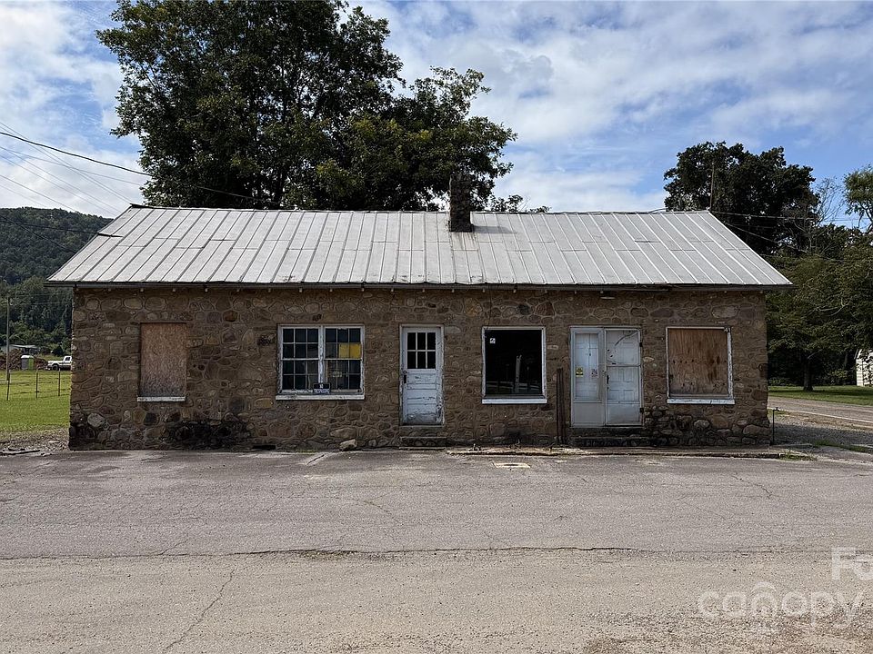 The single-story building has a metal roof and solid river-rock exterior but needs a remodel, so it’s being sold as is. Inside you’ll find a large open space, kitchen/dining area, bathroom, living room, and two extra rooms.