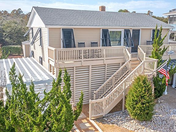 DIRECT BEACH ACCESS across the street. Classic beauty on a 32' high dune ridge in the quaint town of Southern Shores. Property has been immaculately kept and meticulously maintained as a primary residence and has been used for a multi-generational family. Could also be used as a great vacation rental or second home. Easy beach access within minutes to NC 12 crosswalk. Close to stores and restaurants by foot or take the bike path. The house offers two units one on each level. Each level has its own individual central air and heat Upstairs you have three bedrooms with living and kitchen and one bath with interior offering original tongue and grove walls and ceilings, and hardwood floors throughout, with central heat and air conditioning. The larger bedroom is located on the southeast corner, offering a roomy king size bed with new carpeting. The northeast bedroom easily fit a queen size bed and the third bedroom was used as office space. Upstairs updates include newer kitchen cabinets, counter tops,  fixtures and stainless appliances and tons of recessed lighting. Ceramic flooring in kitchen and bath, along with tasteful custom shower and builtin shelves for storage.. Lower level offers two bedrooms, kitchen, and living room with electric fireplace. The additional office space/baby room or whatever the buyer chooses it to be. Also separate laundry room. Lower updates include new cabinets, counter tops, gas range, stainless appliances and fixtures, and custom ceramic shower and tasteful fixtures. Outside improvements include custom operable storm shutters, a Pergola to enjoy from getting too much sun or to relax with a morning coffee or your favorite beverage in the evening; a detached shed with plenty of shelving and storage space; and a fenced in dog-run area for your pup and plenty of parking. Rental Projection on file.