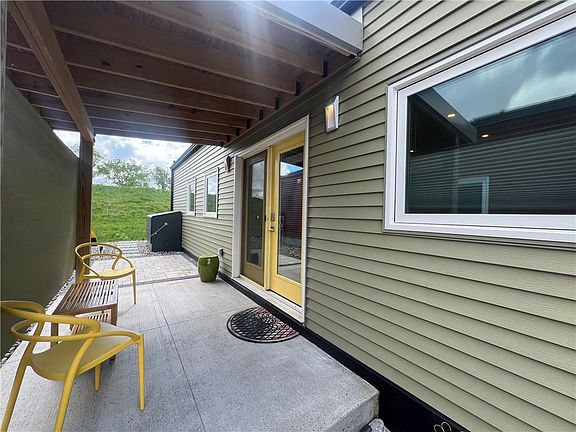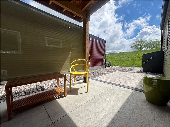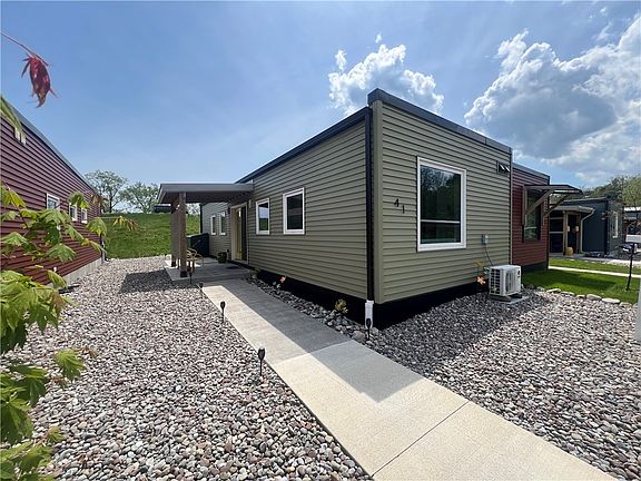 In a small, vibrant community near Seneca Lake lies Solar Village. A sustainable haven with the 10th most energy efficient homes in the US as recognized by Resnet. A large open floor plan adorned with luxury vinyl flooring, accented by freshly painted walls. A grand quartz peninsula invites you to gather around, stainless steel appliances ,dishwasher ,refrigerator microwave, stove, washer/dryer included. Cozy corners beckon in the living room, while two ample bedrooms each boast their own private baths. 1st flr laundry. The exterior features metal siding w/a 50 year guarantee . Rubber membrane roof nestled beneath the solar panels. Step out to your covered patio with two additional patios as well. Low maintenance living complemented with a 2-car detached carport. A mere 2-minute walk through the city tunnel (will be renovated by the city in the future) ushers you to the serene shores of Seneca lake. Embrace the outdoors with the nearby bike trails, beach area, Indulge in the local culinary eateries and Finger lakes wineries. A stroll to downtown Geneva offers a vibrant scene of music and dining.Electric heat & AC under $20.00 a month. Short term rentals are not allowed per deed.