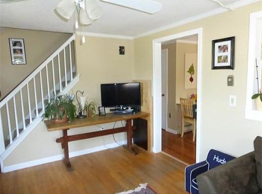 Charming bright,sunny end unit updated throughout, that offers 3 floors of stylish useable floor space. This unit has all new windows and doors. Kitchen features upgrades, including brand new cabinets,dishwasher,hardwood floor, custom pull-out spice racks, solid surface counter tops with undermounted sink, along with ample pantry space. Livingroom features hardwood flooring, new crown molding and lots of natural southern light! Downstairs, stylish and functional affording a room to relax. Large windows with awnings, great office space and enclosed laundry room.Two bedrooms , well appointed with new carpeting and fresh paint,bright and cheery with views of the neighborhood. Truly an end unit! Close to the bike path and all amenities. A must see