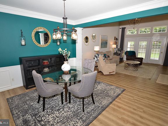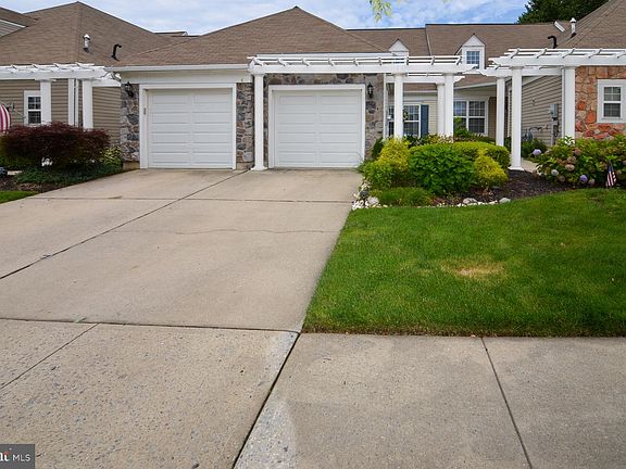 Located in the sought-after senior community of Traditions at Hamilton in Hamilton Township, this well-maintained Watson model home provides comfortable, one-story living. Standing out as one of the largest two-bedroom model, the Watson boasts an attached two-car garage and double-wide driveway for added convenience and storage. The home features an open-concept design with upgraded luxury vinyl flooring throughout the main living areas. The eat-in kitchen has updated stainless steel appliances and plantation shutters, offering open views into the spacious, combined dining and living room. The transition from the dining room to the living room is seamless, with the living room showcasing vaulted ceilings and built-ins surrounding a cozy gas fireplace. This space leads out to a paved patio, ideal for outdoor enjoyment. The sizeable primary suite indulges with a high-end en-suite bathroom, equipped with a premium shower, double sink vanity, ceramic tile flooring, and a generous walk-in closet. The second bedroom also offers luxury vinyl flooring and plantation shutters, adding a touch of elegance. The home also includes a dedicated laundry area. Residents of the community may appreciate the vibrant 55+ lifestyle amid professionally landscaped surroundings with sidewalks and aesthetic lighting. The nearly 7,000 SF clubhouse acts as the community's vibrant hub, featuring a fitness center, multiple gathering spaces, and a catering-equipped ballroom for social events. Outdoor amenities comprise a pool, tennis courts, pickleball, a putting green, scenic ponds, a garden, a gazebo, and walking trails, contributing to leisure and enjoyment.
