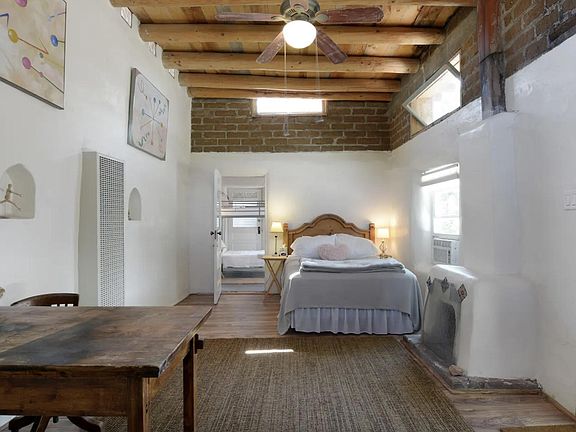 This is a lovingly furnished and accessorized turn key property that is located on one acre in beautiful Nambe, NM, just 20 minutes north of downtown Santa Fe. This an authentic Adobe home that was recently renovated with new appliances and all new bathroom tile and fixtures. The windows were replaced along with the floors. This beautiful Adobe has two fireplaces, one in the bedroom and one in the living room, as well as classic Vega ceilings and clerestory windows. There is a double bed in the master bedroom with a new Beauty Rest mattress, and a bunk bed in the dressing room/walk in closet off the main bedroom. There is a Roku television that includes Hulu, Netflix, Prime, Apple, Paramount+, and Peacock. Also included is good wifi, Alexa, water, electric and gas. The Adobe has its own parking space with lighting, a fenced in front yard with a 15 foot high wall that is covered in Virginia Creeper for privacy. There is a gas grill on the portal, and an umbrella with table and chairs in the front yard. This is a lovely gated property graced by ancient Cottonwoods in a premiere location. We have Maine Coon kitties on the property so only small dogs or kitties are welcome. Rent is due on the first of each month. The damage and cleaning deposit is due upon occupancy.