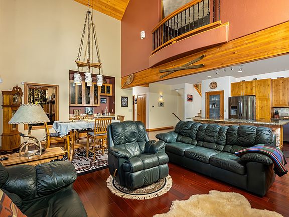 This beautifully maintained property sits on over 2 acres of fire-wise thinned forest, offering both privacy and peace of mind. Thoughtfully upgraded with high-quality appliances, luxury furnishings, and quality finishes throughout, this home combines comfort with sophistication. A gourmet kitchen designed for culinary excellence is perfect for both everyday living and entertaining in style. The towering rock-wall fireplace exudes rustic elegance and warmth. Stunning floor-to-ceiling windows create a seamless connection between indoor living and the large, reinforced covered decks built to withstand the elements and support outdoor living year-round. With ample space for dining, lounging, and gathering, this is truly an extension of the home—where nature and luxury meet. Unwind after a long day in the private hot tub, perfectly positioned to take in the serene mountain landscape. Key features include a home theatre room, an elegant wine cellar, an electric firewood hoist plus two spacious storage sheds for added convenience. Additionally there is a 30 AMP RV hookup for visiting guests and a redone gravel driveway for improved access and curb appeal. Access to nearby hiking trails, stocked fishing lake, PGA rated golf course, ski resort and country club all just minutes away. A true mountain oasis, blending modern upgrades with natural beauty. Move-in ready with furniture and meticulously cared for—this is the mountain lifestyle at its finest.