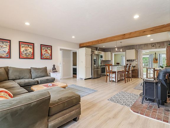 This stunning eco-friendly home has been completely renovated is nestled perfectly on this half acre lot on a quiet cul-de-sac. The open floor plan flows from a bright inviting living room into the gorgeous kitchen w stainless steel appliances, granite counter tops custom island. Kitchen overlooks the den/dining area w sliding glass doors to the backyard. Beautiful wood sliding barn door opens to pantry laundry area. Two nice sized bedrooms a fully updated bathroom w deep soaking tub, custom tile new vanity! This is a super insulated, high efficient home designed for sustainability comfort. Never pay a utility bill! 100 of heating, cooling power is covered by rooftop Solar Array hidden in the rear of house. Solar array has a backup battery in case of a power outage. The main heating cooling are powered from a high efficiency Mitsubishi Mini Split. When the temperatures drop, the entire house has floor radiant heat for complete comfort or you can cozy up to the new clean burning Vermont Casting woodstove. Private backyard w mahogany outdoor shower, raised garden beds, raspberries, apple trees, blueberries grapes on the trellis! 1 car garage a 900 sq ft, 15 ft high Rhino Shelter storage structure! A must see!