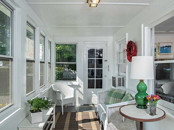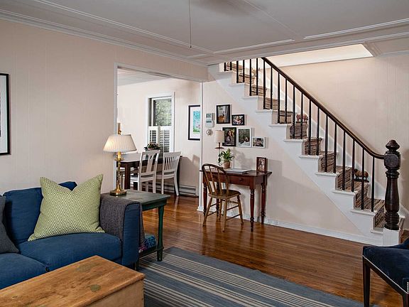 Village home is stylish and sweet and flooded with natural light. The main floor offers an open floor plan of LR, DR and Kitchen, an office and a 1/2 bath. The upper level consists of a large Master BR w/ cathedral ceiling, skylights and exposed beams, guest BR and 1 full bath. Relax with a book on the enclosed 3 season porch or enjoy summer get togethers with friends on the back deck. Conveniently located off a quiet side street within strolling distance to restaurants, cafes and the library. Fenced in yard ensures Fido and children are safe at play. Easy living for weekends or full time. Come see this little gem today!