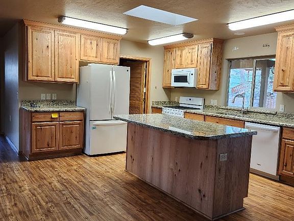 Recent price reduction! First Owner offers desirable split BdRm floorplan situate with all City amenities; Bold and beautiful inside and out. Great Room offers ample Kitchen and Bar having hard surface countertops, plus Dining and generous LivRoom area, boasting Luxury Vinyl Plank flooring, free standing Natural Gas Fireplace. BdRms are carpeted. Spacious Pantry/Laundry combo. Enjoy huge rear covered patio, plus oversized front composite deck. Metal Roof overall. Handicap accessible Ramp. Shed too! and NO HOA