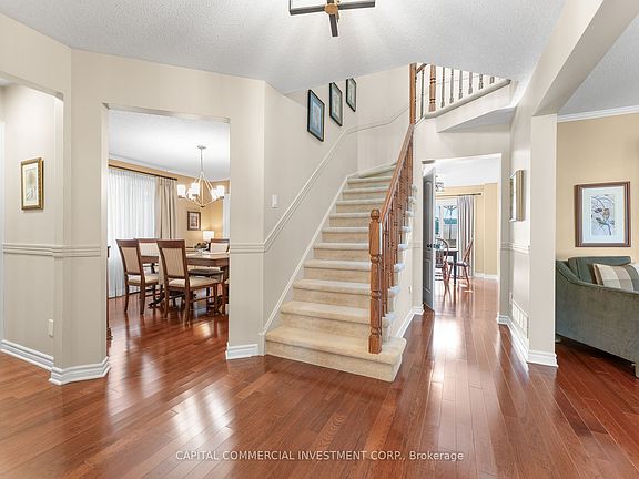 Welcome to this impeccably maintained 4 bed / 4 bath home on a quiet crescent in Bridlewood, blending modern design with timeless style. Upon entering the spacious entryway, the main floor showcases hardwood flooring, large windows with California shutters, and a floor plan that lends itself to growing families; boasting a sizeable living room, private dining room, convenient main floor laundry, powder room, and cozy sunken family room with gas fireplace. The expansive custom eat-in kitchen is freshly renovated with granite countertops, ample cabinetry and stainless steel appliances. The patio door from the eat-in kitchen provides easy access to the peaceful, south facing backyard, with large deck, creating the perfect setting for outdoor dining, relaxation, or entertaining. Surrounded by beautifully landscaped perennial gardens and a lush cedar hedge for maximum privacy, the backyard is a true retreat. Both the front and rear yards have been fully landscaped with the utmost detail in mind. The charming staircase to the 2nd floor is filled with sunlight from the updated skylight. Through French doors, the stunning primary suite awaits, featuring a spacious walk-in closet, a serene reading nook with window bench, and a beauty station. The open-concept ensuite is nothing short of luxurious, offering dual sinks, an open concept rain shower, heated floors and a spa-like atmosphere. An adjoining bedroom connected to the primary suite is ideal as a nursery, cozy retreat, or can be easily converted back to a private 4th bedroom. The secondary bedrooms have generous square footage conveniently located near the updated 4-piece bath. The fully finished lower level adds even more living space, including a large rec room, 3-piece bath, and generous storage area complete with built-in shelving. Access Bridlewood Park via public path on Tower Hill Crs. Located within walking distance to top-rated schools, shopping, recreation and more! Roof 2019. Furnace 2023. Windows 2015-2019.