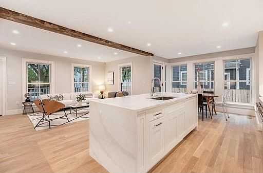 Newly built, and beautifully crafted, this new single-family like home with a restored Greek Revival front covered porch and fenced-in private yard is splashed with sunlight and designed for comfort and ease of life. Youll be stricken with its well laid-out open living areas showcasing floor-to-ceiling windows, custom built-ins, a cook kitchen with Thermador appliances, an 8 long island seating 4 and a bay-window dining room addition for memorable dinners. Glass door opens to a sunny landscaped garden with a grass carpet and paved patio. Second level houses 2 bedroom suites with cathedral ceilings, modern bathrooms and custom closets. Light abounds in the expansive LL family/ media room with a 3rd bed/3rd bath and space for office/ gym. Brand new and inspired, this home is nestled in a quiet residential neighborhood within walk to Inman, Kendall and Central squares.