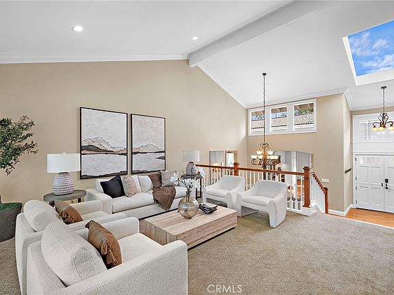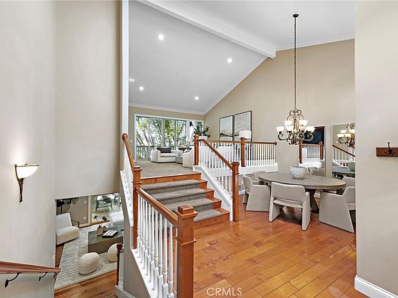 The home’s grand entry makes an immediate statement, with custom double Dutch front doors and lush, manicured landscaping. Inside, the meticulously crafted remodel showcases rich hardwood floors, soaring vaulted ceilings, and intricate crown molding. Abundant natural light fills the elegant living room, complete with a refined fireplace and access to a scenic back deck—perfect for enjoying the serene surroundings.