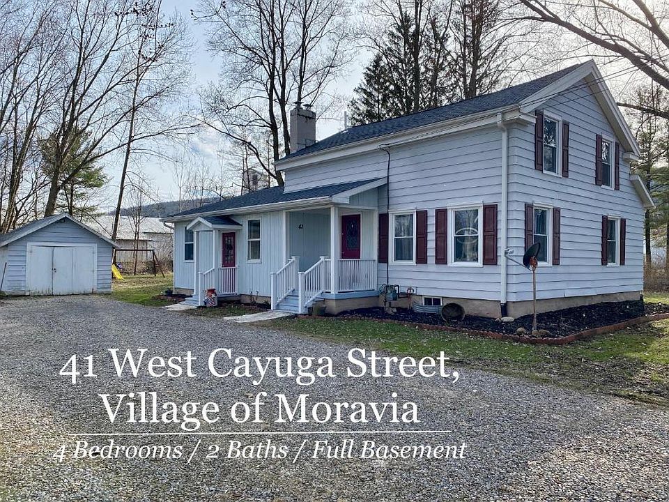 MUST SEE INSIDE! Classic 2 Bedrooms Up & 2 Bedrooms Down with a Full Bath on each level in walkable Village of Moravia. Sitting on a large lot, there's room to run & play! Welcomed into the home through Mudroom (places for shoes!), then Eat-in-Kitchen with Island and Large Bay Windows that let in great light. Original beams! Large Living Room with a toy space for all the goodies. Two Bedrooms ( or Home Office) located on Main Level with a Full Bathroom. Upstairs you will find Cathedral Ceilings with Two Bedrooms with a large Full Bathroom with Step-in Shower. There is a full basement - currently being used as the Home Gym / Laundry / Storage Area! Two Outbuildings. Lot is large and plenty of room to run!