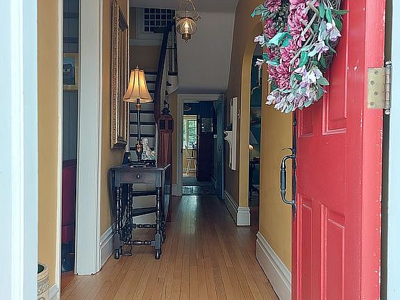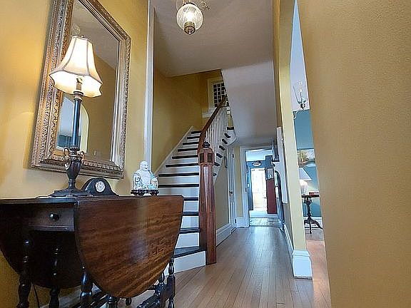 One of Hummelstown's Oldest Homes, original portion is over 250 years old. Modern but with the past preserved. George Washington is rumored to have Dined here on his way to the Whiskey Rebellion. Enter from Main Street to the Foyer with hardwood floor. On the right is a spacious Living Room with large fireplace and gorgeous mantel. Moving into the Dining Room with rear stairs to the Master. Next is a recently remodeled Kitchen with ample granite counter tops and panoramic view of the yard. From the kitchen you enter the Family Room with access to the basement containing a Workshop and Wine Cellar. The restored Log Room with bar and library has a beautiful wide plank floor. The second story has 2 large bedrooms and a master suite. The Hall Bath is recently remodeled and houses the laundry. The Master Suite has its own sitting/exercise room bath with walk-in shower and walk-in closet. From the Master you have a balcony with a view of the yard and the town. The Original Barn contains a 3-bay garage and another workshop. Privacy in the middle of Town.