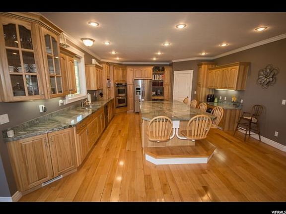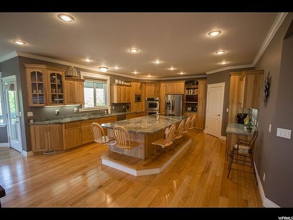 Impressive Two-Story Logan East Bench home with room in all the right places! Stunning kitchen with massive center island, hardwood floors and stunning granite counter tops with hickory cabinets. Immense two story great room with fireplace. Spacious master bedroom with sitting area. His and hers closets with built-in organizers. Large Master bath with jacuzzi tub, two sinks, and shower with two shower heads. Two additional mini suites with large bedroom and bath. Large covered deck with valley views. Professional home security system included. Huge laundry room with cabinets, sink, and mudroom area. Formal living room/dining room. Three offices or craft rooms. Professional 3D home theater room fully equipped and furnished. Two finished multipurpose rooms under suspended slab garage. Extra large three car garage. Basement kitchenette with cabinets and walk out to backyard. 7092 sq. feet 7 bedrooms 4.5 bathrooms. Your dream home awaits!