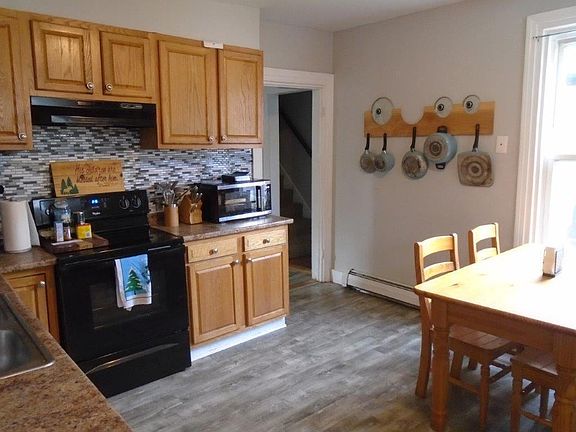 Affordable, in-town New Englander, near shopping and restaurants. Spacious, updated kitchen with oak cabinets. First level has laminate flooring, dining room, living room, kitchen and half bath. Upstairs has carpeting, 3 bedrooms and a full bath. Nice walk up, full height attic for storage. Laundry is located in the mudroom/entry way. Newer, wall-hung propane boiler. A portion of the driveway is on a right of way over the neighbor's property.