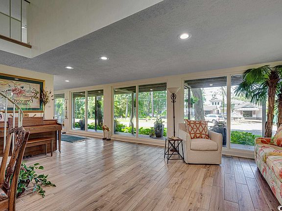 Unique contemporary home with outdoor gunite pool, pool house, 2 car garage, home office (can be used as mother-in-law quarters w/small kitchen & bathroom). Open/Airy floor plan. Formal Living Room w/tile flooring & fireplace. Sunken, large Great Room w/tile flooring & fireplace. Master bedroom on ground floor. Master bath w/jet tub, separate shower, and sitting area has access to pool area. Large kitchen w/solid surgface counter tops, lots of cabinets, island, breakfast nook & chair rail molding. Upstairs room & play area not reflected in heated square footage. 14x16 4th bedroom measurement in listing is obtained from home office area. Home has 2 heat pumps & wall unit. 2 car garage with lattice walls. Custom Home Decorating customized & decorated the house except hallway & office area. Just a few blocks to the beach.