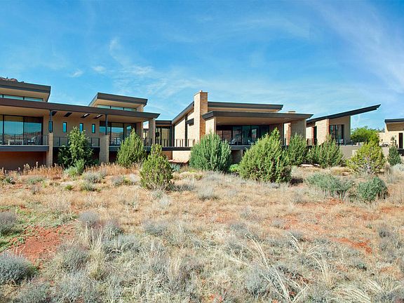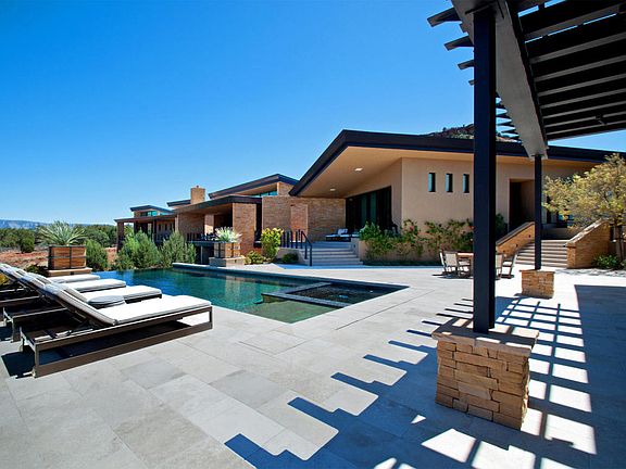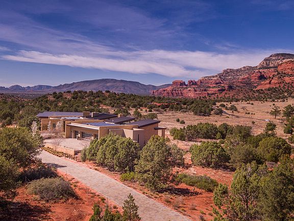 This stunning desert contemporary home sits harmoniously on its 4.65-acre site backing to pristine National Forest land, capturing the incomparable red rock vistas and mountain views within the beautiful and prestigious Aerie community in west Sedona. Combining stunning architecture, a fully single-level floorplan that flows seamlessly from end to end, heightened attention to every exquisite detail,and majestic panoramic views, this is a true world-class residence on a level all its own in Sedona.The long, gated private driveway brings you up to the elegant entry with beautiful desert landscaping. A soulful sense of privacy against the National Forest blends into the expressively inclusive nature of the home and its welcoming spirit as you approach the front entry. (see more)