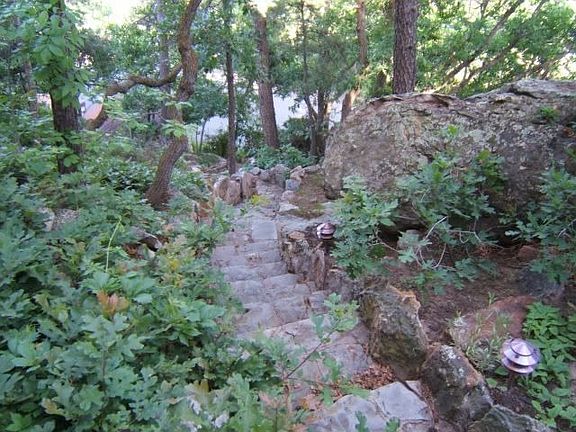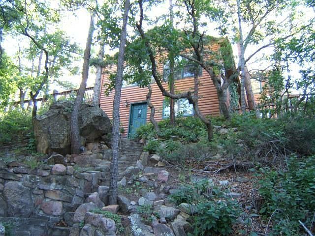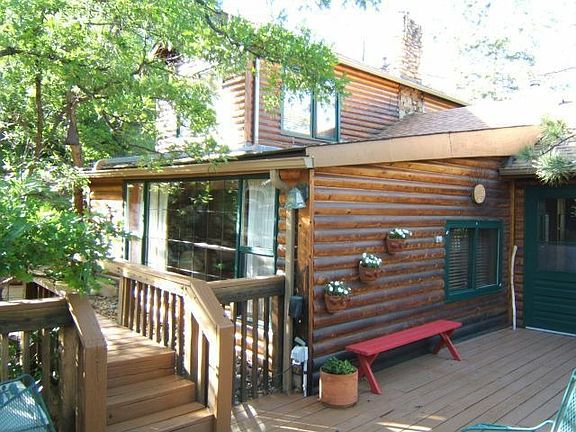Private retreat nestled on nearly an acre of woods. Listen to Bear Creek as you enjoy one of the two large decks or the covered stone patio and water garden. Beamed ceilings, knotty pine, moss rock fireplace, and large windows add to the open and bright feeling of this immaculately maintained home.