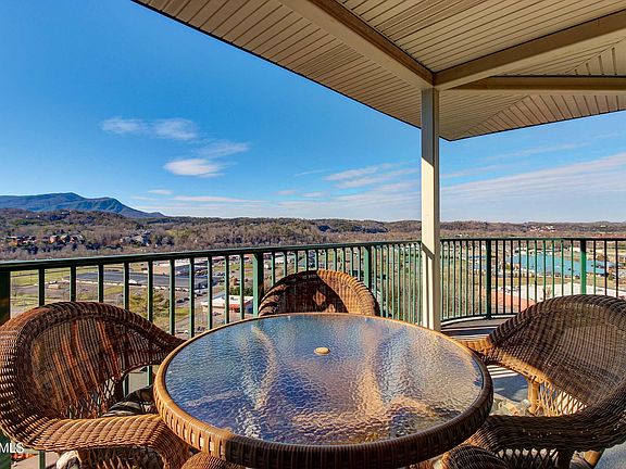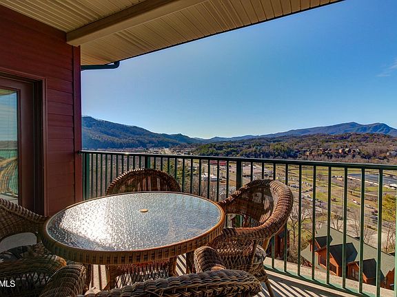 Breathtaking mountain & valley views that transform to a twinkling spectacle of city lights at night are just part of the charm of this top-floor end unit in Big Bear Lodge & Resort. The great room has an electric fireplace for ambience, and opens to a wrap-around covered balcony overlooking the panorama. Next to the built-in desk a log dining set and breakfast bar provide plenty of seating, while the kitchen features flat-panel cabinets, granite countertops, and stylish black appliances. The spacious master suite offers private access to the balcony, while a stylish glass block wall accents the luxury bath with dual sinks, whirlpool tub, and a gorgeous custom tile shower. A small alcove off the entry accesses the second bedroom, a shared full bath, and a utility/laundry closet with stack washer/dryer. The resort offers a broad range of amenities including indoor & outdoor pools with whirlpool spas, a fitness room, recreation room, and a spacious conference room with kitchen. Located just minutes off the Parkway in the heart of Pigeon Forge, this unit is an ideal low-maintenance primary or vacation home as well as a standout rental performer - schedule a showing soon, and see how it works best for you!