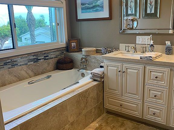 Beautiful 2100 plus sq. ft. 3 level condo with ocean views from living room, dining room, balcony, and master bedroom. Located in Pier Bowl area. Walk to downtown (Del Mar Avenue), where you will find great restaurants, coffee houses, and shopping. Approximately 600 steps to the pier, San Clemente Pier Amtrak and Metro link train stop, and beach boardwalk. The Spanish style building has only 8 units, providing tranquility and privacy. Fully equipped modern kitchen (with marble counters and hardwood floor) has dishwasher, double door refrigerator, electric stove and large pantry. Formal dining room seats eight. French Oak Harwood floors added throughout living area, kitchen and bedrooms. Large marble fireplace in the living room. Large flat-screened TV's in the living room and master bedroom. The pool is located steps from the front door. Large pool patio area with furniture, lounge chairs, hot tub, dressing room, shower, and bathroom. The pool house is equipped with a pool table and table tennis. Amenities include: Gated parking. Dumb waiter from garage level to all floors.