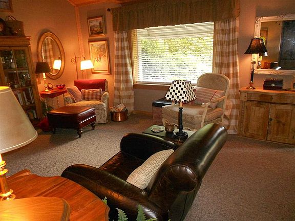 Charming and inviting. French Country design with so many wonderful details. Home has living room with built in corner cabinet. Special ordered blinds over the large picture window and silk curtains will remain with home. Features a hand painted rounded doorway into the kitchen. Kitchen has the a fireplace with a copper pot rack. This will convey. Counters are ceramic with with double sinks. Lots of cabinets. Bar with seating. Guest bedroom, bath, and laundry on main floor. Upstairs is a charming loft master bedroom with bath. Two additional bedrooms, and a rec room that could also be a fourth bedroom. You'll love the alcove for reading or have a small office. There is a large barn in the back of the property. The lower barn has a new roof. The others have no leaks. The back yard of this property is an oasis. Lovely plants, stone work, and patio. Updates for this home are: kitchen appliances are less than two years old. Carpet is newer. New Trane Heat Pump, New water line from house to street, and new electrical upgrade . This is truly a house that you cannot describe with words. It is one of the most unique houses I have ever listed. You will be amazed at the quality and it has such a personality of it's own. The owner had an antique shop for years in the lower barn. So many possibilities for this property.