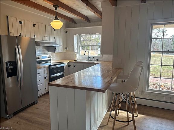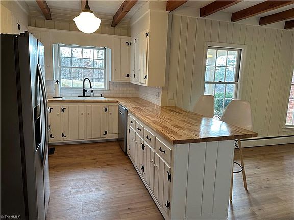 1960s renovated ranch home, Country Living is within 15 Minutes of major highways, and Downtown Winston Salem, Beautiful rolling 2.5 acres w/stream on a Lovely dead-end street w/ a new million dollar homes being built on 30 lots at the end of the street (Merrin) This one-level ranch has a new kitchen and Baths, outside a new slate patio and fire pit as well as a potential Barn ( needs alot of love however ) 3 br 2 baths, sunroom, and double carport. Gas logs in both the living room and Den. The basement has been freshly painted and has a shop and plenty of storage as well as a full bathroom. New electrical newer H/P, and well, city water is available. Additional acreage can be purchased separately.