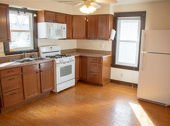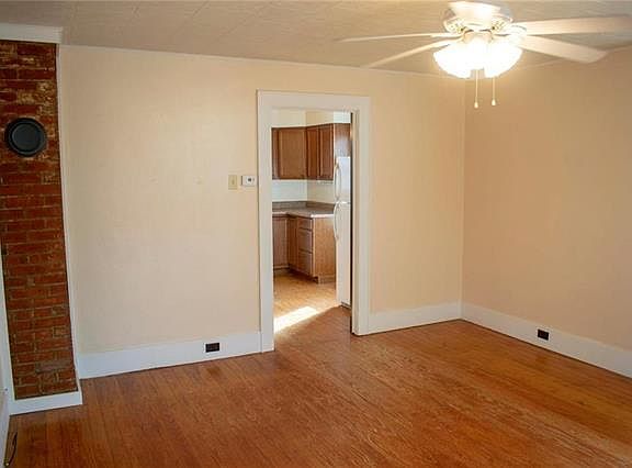 Don't let this on get away!! It is absolutely adorable inside! Move right in! Remodeled within the last 10 years. Freshly painted with all original hardwood flooring and moldings, and single-hung tilt-in vinyl windows throughout. The charming living room features an exposed brick chimney through to the upstairs. Kitchen features includes: refrigerator, gas stove, built-in and microwave. Ceiling fans in living room, kitchen, and main floor bedroom. Main floor bathroom has ceramic tile flooring with original subway tile in bath/shower. The main floor laundry room comes with washer an dryer and exits onto a cozy wood/vinyl deck. The spacious upstairs can be used for an additional room or office space with plenty of closet space for storage. The basement is unfinished but has great potential for small family/rec room. Available for Lease Purchase