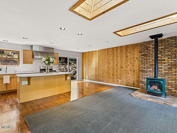 A spacious home RETREAT, yet super close to NAU. No HOA! Can create a duplex/rent rooms. Triple-split level layout. Half the sq ft is upstairs w/master suite + private deck, 2 other bedrms & another full bath. The middle level w/hardwood floors, incl. living room w/gas stove & skylights, kitchen w/breakfast bar, plus dining area w/forest view. 1/2 the house is downstairs: 2 bedrooms, full bathroom, library, remodeled kitchenette & oversized laundry room w/sink & storage, plus giant living room w/gas stove & picture window. New windows here. Fenced lot exceeds 3/4 acre with pines. Private 1/2 basketball court. Matching coop w/fenced area offers fresh free-range eggs. Southeast driveway helps with fast snow melting. 5 car parking. 2 new decks invite you to take in the forest views w/coffee. Improvements since 2015: