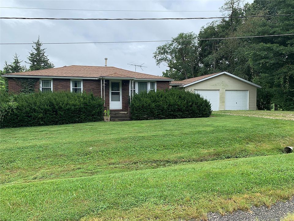 Ranch home on 2.59 acres. Living room shows original wood flooring. 3 bedrooms and 1 bath. Walkout basement is unfinished. Newer roof shingles and updated vinyl windows. Furnace and hot water heater replaced in 2017. 2 car oversized detached garage. Sale is "AS IS" - no repairs. Buyers to verify all MLS data, including but not limited to square footage, measurements, taxes, exemptions, lot size, etc.