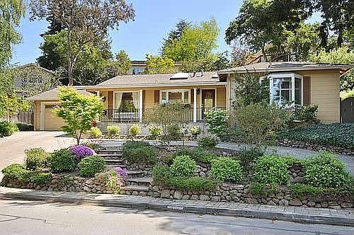 Charming 2 bedrooms 2 1/2 baths plus den/office and 2 car garage with a lot of storage space. Updated kitchen with granite counter top, hardwood floors, den with half bath and wet bar, large living room with fireplace, French doors in living and master bedroom. Bay window in office and second bedroom. Private yard with flagstone patio and picturesque waterfall. Beautiful circular paved driveway