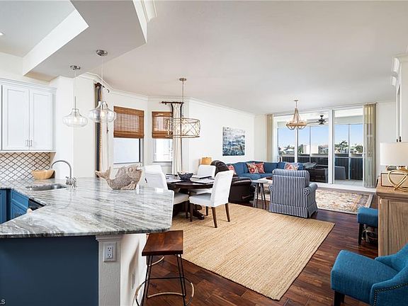 A rare gem in coastal living, this residence offers features that truly set it apart—an oversized 1.5-car private garage included in the sale and an expansive 400+ sq. ft. open-air terrace showcasing panoramic views of Vanderbilt Bay and breathtaking sunsets. Outdoor living of this scale is seldom found in a condominium. The terrace is being updated with new brick pavers for a sleek, modern look, while a private staircase provides direct access to the pool walkway. With its generous layout, the space is perfect for entertaining, sunbathing, or even creating your own garden retreat. Inside, the 3-bedroom + den, 2.5-bath home features an open floor plan with richly toned, elegant wood flooring in the main living areas. The renovated eat-in kitchen includes stainless steel appliances, induction range, granite countertops, and classic shaker cabinetry—all designed to complement the home’s elegant interior and maximize those water views. The vibrant blue cabinets and striking designer wallpaper bring a cheerful pop of color and personality to the condo. Perfect as a primary residence or investment, this residence benefits from one of the most flexible rental policies in the area, allowing weekly rentals. Boaters will love the opportunity to purchase a 40' boat slip with lift in this prime location. Regatta offers top-tier amenities: two resort-style pools including a tranquil waterfall pool, two fitness rooms grilling areas, and clubhouse. Just 500 steps to Vanderbilt Beach and minutes from The Ritz-Carlton, Mercato, Pavilion, and Waterside Shops, this is the ultimate Naples lifestyle. With nearby plans for tennis and pickleball courts, there’s something for everyone. Pets welcome—because adventures are better with your furry sidekick! The community is gated, and beautifully maintained, Regatta is a true waterfront sanctuary. Whether you're looking to relax, entertain, or generate rental income, this property offers it all—with space and features that set it apart.
