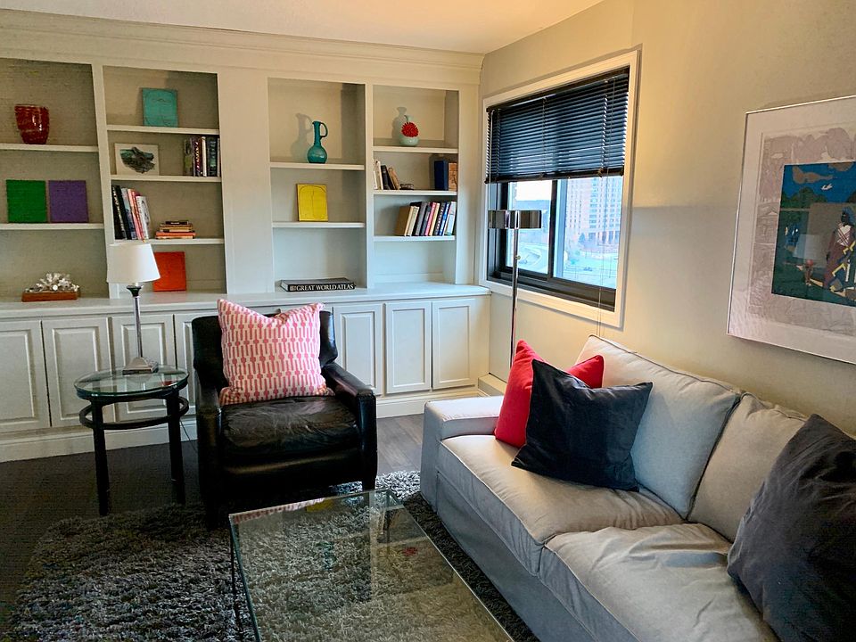 ONE BEDROOM/DEN The best of downtown living W/O the traffic/parking hassle. Designer owned, furnished one bedroom/den condo, in security building -perfect for a couple or single person. Corner unit overlooking Loring Park, Downtown, east and west views. Newly remodeled, new carpet, bathroom, kitchen, built-ins. Stainless appliances, marble center island, and backsplash, convection oven, built in wine rack. Cozy den with builtin bookshelves and flat screen TV. Builtin desk/workspace in living room. Bedroom with king bed, built in bookshelves, lots of closet space, and beautiful view. Amenities; security building, on site 24 hr. manned desk, rooftop pool, gym, library, community room, heated garage. Laundry on floor, shared laundry on floor, (shared with 3 other apartments) Walk to Walker Art Center, Loring Park, Downtown Restaurants. Easy access to highways in all directions. FLEXIBLE START DATE. 6 months. No smoking, no pets.