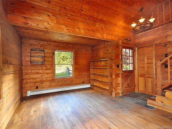 What a find! Riverfront property - 175 feet of direct waterfront. Beautiful & easily accessible, providing lovely water views - a perfect backdrop to an overall remarkable setting. The lovely natural landscape is well-suited to this log home. Solid, with an appealing interior design, the warmth, authenticity and charm are already here. In need of some TLC and updates, it is a comfortable place to make your own and enjoy the satisfaction and rewards of bringing out all it can be. The delightfully open interior features a front-to-back LR with stone FPL, 2 story ceiling and adjoining enclosed porch. The spacious kitchen includes a dinette with sliders to a wrap-around deck. There's a main level BR and full bath and an upper level BR and powder room for guests. There's also a versatile office/loft space and sitting area/landing overlooking the LR and the long view over the flowing river bank. Enhanced by warm wood walls and floors. There's a garage around the back, accessing a walk-out basement with laundry, powder room, work sink and storage space. New boiler 2019. A deep and wide front lawn provides distance and protection from the road. The very large rear portion of the lot features a brook and offers great space for gardening and recreation. The path to the river front is a gentle and gradual slope. Add your vision to an appreciation of this uniquely engaging place and live surrounded by it's beauty each day.