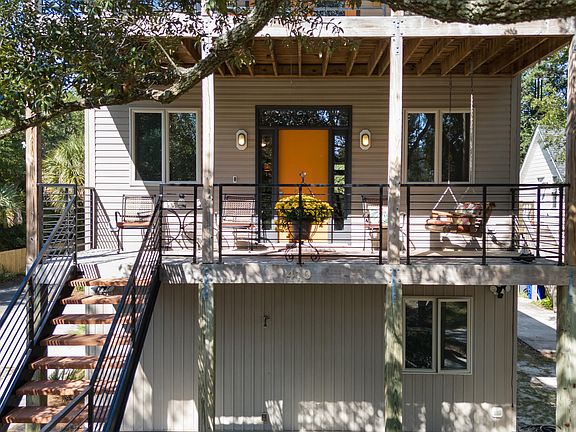 Welcome to this stunning contemporary retreat, perfectly nestled on a serene, tree-shaded lot just minutes from the beach. This beautifully crafted home offers 1,928 square feet of thoughtfully designed living space across three levels, featuring 3 bedrooms and 3.5 bathrooms. The first floor includes a spacious garage and an additional 285 square feet of heated flex space, complete with a full bathroom, a small kitchenette, and a versatile area perfect for a home office, guest suite, or private retreat. The second floor serves as the heart of the home, accessible from both the garage and the inviting front staircase. This open-concept living space boasts a chef's kitchen with granite countertops, a stylish tile backsplash, a gas cooktop, floating shelves, a built-in wine shelf, a generous pantry, and an island with seating. The kitchen seamlessly flows into the dining area and a bright, airy living room anchored by a cozy gas log fireplace. A conveniently located half bath and a dedicated laundry room enhance the functionality of this floor. Step outside to enjoy the coastal breeze on the covered deck, perfect for relaxing or entertaining. On the third floor, you'll find all three bedrooms, including a luxurious primary suite with soaring cathedral ceilings. The ensuite bathroom features dual vanities, a walk-in shower, and a soaking tub, while the expansive walk-in closet provides ample storage. Two additional spacious bedrooms share a well-appointed full bathroom. Throughout the home, unique casement windows invite in the refreshing ocean breeze. Whether you're unwinding on one of the multiple decks or heading out for a quick beach getaway, this home effortlessly blends coastal charm with modern elegance.