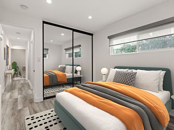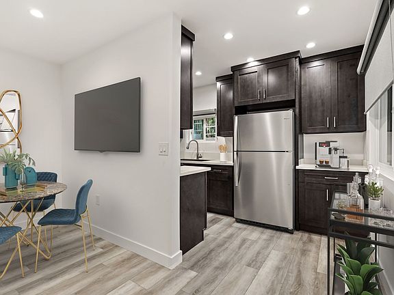 Carefully restored and designed by a renowned LA designer, these late 1950s modern luxury rental homes feature keyless entry door locks to spacious one and two-bedroom floor plans with newly renovated kitchen and bathrooms. The kitchen boasts sparkling white stone quartz countertops with brand new self-closing cabinetry and high-end stainless-steel refrigerators with matching gas cooktop with oven and microwave. iRing doorbells with a smart home video security camera are also included. There's a community washer and dryer on site. Bathrooms feature porcelain tiled bath tubs and glass shower doors. Each rental home also includes central A/C cooling and heating with recessed lights with luxury style cellular shade window blinds and distressed wood plank floors.