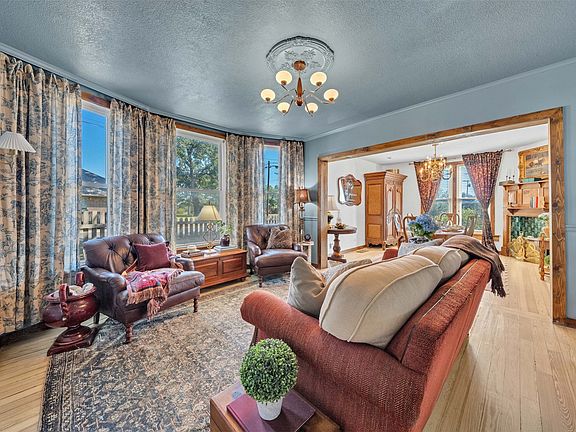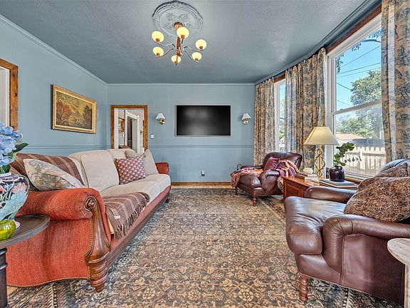 Inside, you’ll find multiple living and dining spaces filled with natural light, original woodwork, and elegant touches like chandeliers, detailed trim, and picture-perfect windows. The kitchen is both functional and stylish, featuring butcher block counters, a large center island with seating, a farmhouse sink, and stainless steel appliances—all complemented by glass-front cabinetry and vintage-inspired finishes.