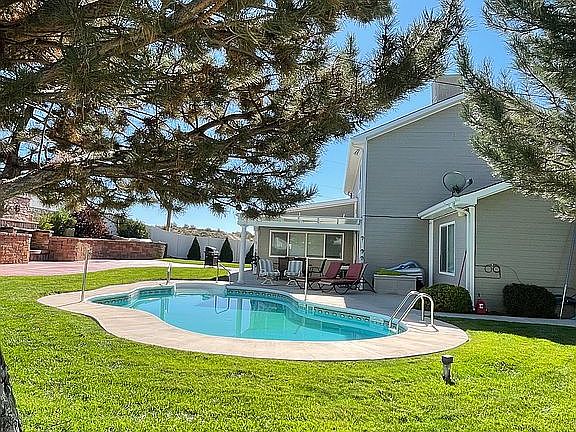 Beautiful family home in a great location. Just freshened up with new paint throughout the house, inside and out, new flooring in most areas, new light fixtures, and more. The guest bathroom and kitchen have been updated. The dining room and family room are just off the kitchen, the windows feature views of the pool and the lovely landscaped backyard, including a beautiful fireplace and generous patio space, great for entertaining! Three bedrooms are located on the upper level, including the spacious master suite with a quaint balcony. The master bathroom has a beautiful walk in floor to ceiling tiled shower, featuring two shower heads. The garden tub is spacious and relaxing. The bathroom vanities have real marble countertops with plenty of cabinet space. The master suite also includes a large, spacious walk in closet with built in shelves and plenty of space to hang clothes. The finished basement, has brand new carpet throughout. The basement includes a bedroom/office and a beautiful custom designed tiled shower. The basement has a lot of potential to be a living space or a game room area. The shop is 3200 sq. ft. The property also has two RV hook ups and dump stations with adequate electric throughout the property. This house is move in ready