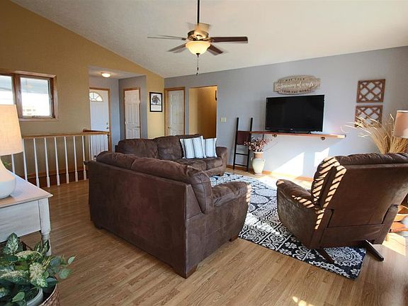 GOLY - this home has a such a tranquil view! Walk inside and be surprised to discover a beautiful wall of windows. Additionally, the living space has wood laminate floors that flow back to the bedrooms and patio doors that lead to the wood deck. The living, dining and kitchen spaces open to each other. The kitchen has a breakfast bar, high-definition laminate counters with under-mount sink, and great counter space. Right off the kitchen is the convenient laundry/mudroom with a sink and closet space. The three main-floor bedrooms include a master with en suite and walk-in closet. The basement has two additional bedrooms (SO 5 TOTAL!) with egress windows, a very large family space, and a bathroom. A large storage room and a caterer's kitchen are additional basement surprises. Outside you will find extra yard space, a double detached garage, an additional shed, and a cute play house. This modern house is one that you need to walk into to appreciate its beauty and functionality.