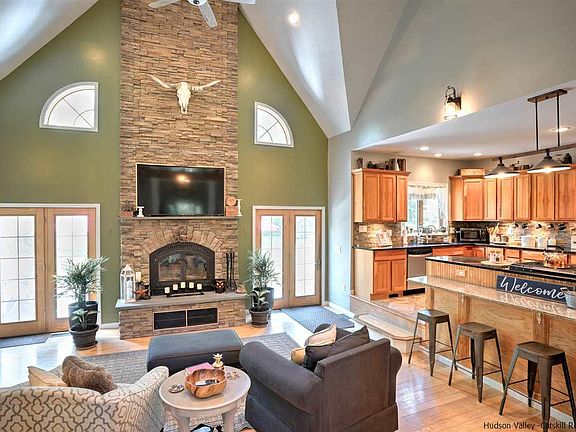 Finally, new inventory that checks off all the boxes. 410 Park Rd has all the bells and whistles, with 360º of total privacy, located in a super convenient location, (10 min to Metro-North, 10 min to the trendy towns of Rhinebeck, Saugerties and Kingston, 2 minute walk to the rivers edge for kayaking and just 2 minutes to connect to the rail trail) and even has an additional building with 2 car garage with a one bedroom apartment. This custom built home, designed by an esteemed local architect, boasts everything that today's savvy buyer is looking for; a tranquil park-like setting to call home offering that quintessential Hudson Valley experience with an abundance of space both inside and out . This gem is set back off the road on a quiet no-outlet street. It features a beautifully landscaped backyard (great for entertaining) and is framed by lovely mature trees and magnificent rock outcroppings. Walk in to the massive foyer and you can immediately feel the generous space this house has to offer. You're met with views straight through the sunken great room to the expansive back yard with hot tub and fabulous patio, perfect for dining alfresco in the warmer weather. There is a 1st floor bedroom with en-suite bathroom as well as the primary bedroom with en-suite on the 2nd floor. The owners envisioned this house to be the gathering space for the entire extended family for holidays and celebrations. With that in mind, the on demand tankless hot water system ensures that everyone can get a hot shower. There is even a separate wing for the additional 3 bedrooms, away from the heart of the house. This design offers an area for those that prefer more peace and quiet or if one should need a private space to work from home. With over 3,500 square feet situated on nearly 4 acres of land, this substantial home and idyllic setting are sure to captivate you.
