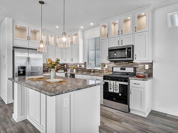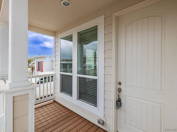This beautiful, brand new home begins with neutral colors and a lovely "Trex deck" porch in a well maintained, friendly 55+ park. With 9' ceilings for a spacious feel, this home offers ceiling fans in the living room, master bedroom, and guest bedroom. The front door has been upgraded, along with rounded corners, faux wood blinds, and cornices through out. The kitchen offers an upgraded stainless steel package that includes side by side refrigerator w/water and ice dispenser, smooth pull out w/spray faucet, microwave, dishwasher and range. Recessed lighting in kitchen and upgraded pendant lights over the furniture style island. This kitchen also offers stunning overhead glass cabinets w/lighting and under cabinet lighting for a wonderful ambiance, The cabinets are white beaded, complimented with a full backsplash. Bathrooms both offer wood framed mirrors, elongated toilets and upgraded vanity lights. The master bath offers a 60" tiled shower w/niche ribbon, and the guest bath offer a shower/tub combo. The laundry room offers full 42" cabinets and a pocket door. This park is central to shopping, banking, restaurants, a mall, concert venues, parks and easy freeway access. Grossmont hospital is only 6.3 miles away.