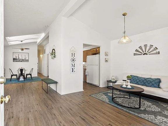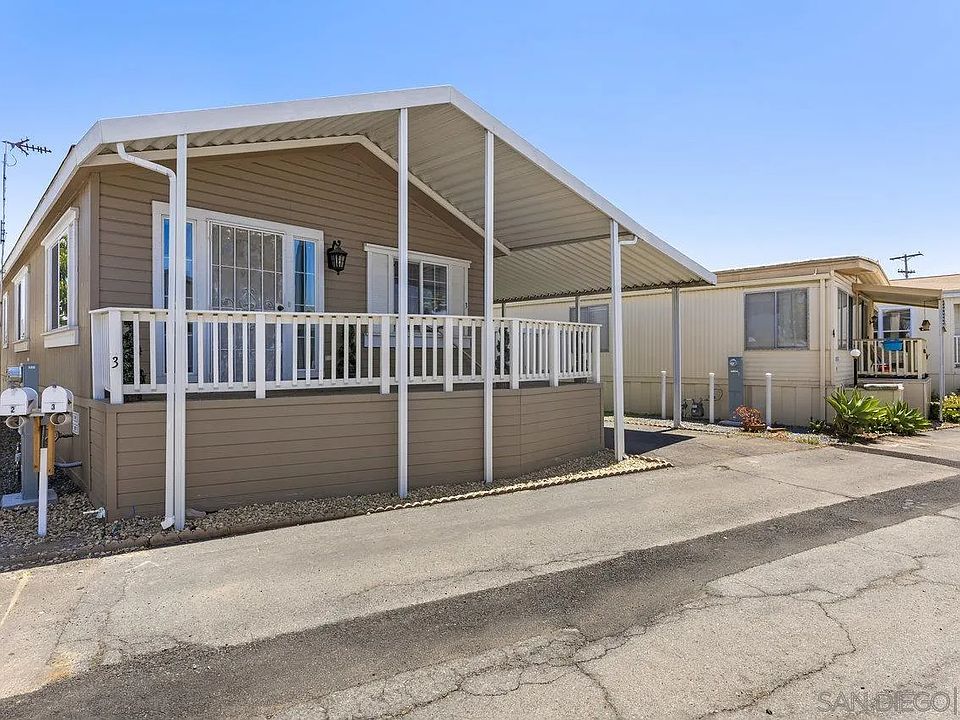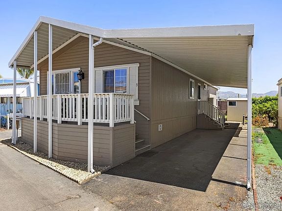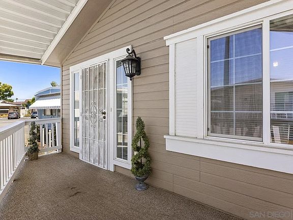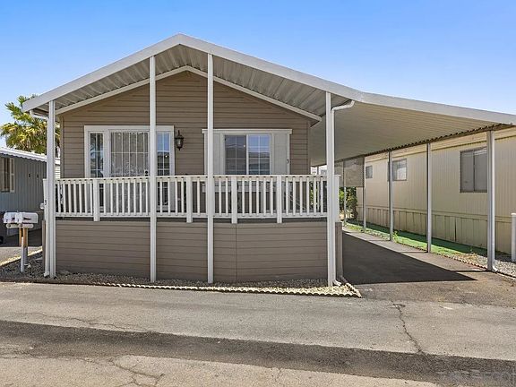 Welcome to this inviting turnkey 2 bedroom 2 bathroom home located in the 55+ community of El Cajon Valley Mobile Home Park. You are greeted with beautiful laminate flooring and a nice open concept. The dining area features skylights for ample lighting and a wonderful architectural beam detail. Some other great features are indoor laundry room, plenty of storage/cabinets and a spacious primary bedroom. Great curb appeal, with a spectacular covered deck and exterior paint job done 3 years ago. Amenities included are Community Clubhouse, Pool and Laundry Room.