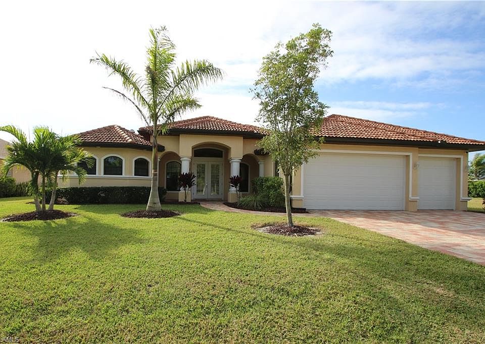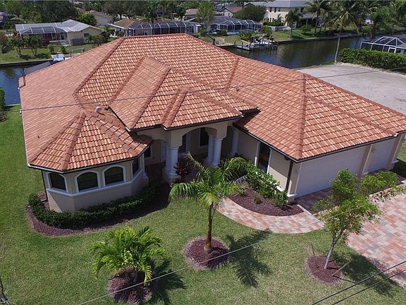 ALL ASSESSMENTS PAID! This beautiful 65' wide, four-bedroom, 3-car-garage home has almost 2,700 sq ft living area and is located on an oversized south exposure lot on the 100' wide gulf access canal "Santa Fe" in a very quiet neighborhood with maximum sun on your pool area. Perfect as your primary residence or vacation home to rent out. 583 sq ft boat dock with 28' slip ready for the boat lift of your liking. Impact doors and windows, 2 tankless water heaters, manabloc system, dividing wall between garages with door, epoxy finished garage floors, insulated garage doors, all pavers sealed, 2 A/C systems, alarm system, automatic sprinklers, camera system, TAEXX pest control system, huge electric and solar heated negative edge pool and spa with decorative dolphins in pebble, hot water outdoor shower, spacious lanai, tray ceilings with background lighting, lighted entertainment center, granite countertops in kitchen, all bathrooms and laundry, plenty of storage space in kitchen with lots of upper cabinets plus little kitchen island, tiled kitchen counter and backsplash, crown molding in most of the house, frameless shower doors and much more. You have to see this home!