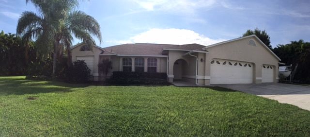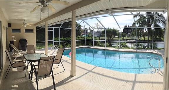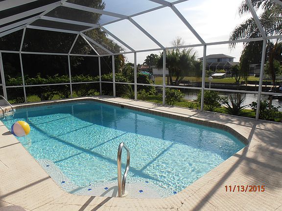 Stunning waterfront pool home in SW Cape. All assessments paid. Fabulous canal view, Lake Kennedy access. Newly resurfaced pool and private dock with southern exposure. This 1975 sq ft. home has 4 bedrooms including a master suite and 2 full baths. 3 car garage. Amazing location on quiet cul de sac. Very private lot beautifully landscaped 0.4 acre site boasting mature producing tropical fruit trees.